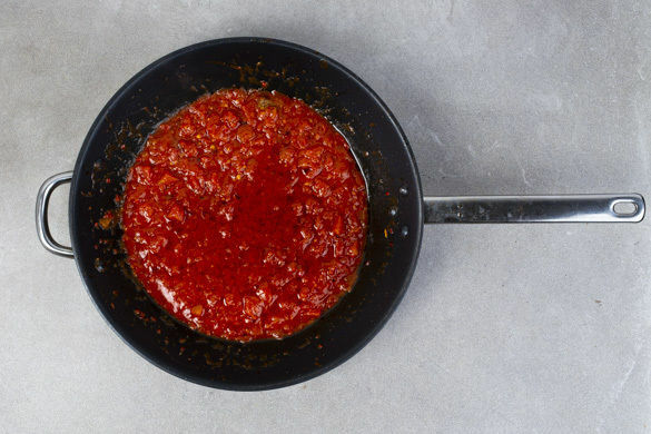 Die Peperoni, den Knoblauch und die Chiliflocken nach Geschmack in einer großen Pfanne mit 2EL Olivenöl bei mittlerer Hitze ca. 1Min. anbraten. Mit den gehackten Tomaten ablöschen, 1TL Zucker dazugeben und 2–3Min. erhitzen. Dann das Brühgewürz unterrühren, die Sauce mit Salz und Pfeffer abschmecken und unter gelegentlichem Rühren 7–8Min. sanft einköcheln lassen.