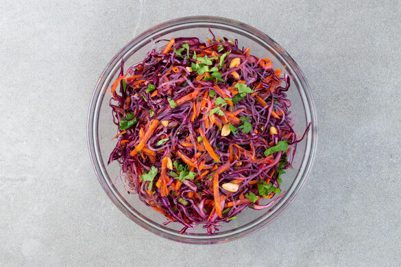 Den Rotkohl in feine Streifen schneiden und mit den Nudeln, den Karotten, den Lauchzwiebelringen, den Erdnüssen, der ½ des Korianders, dem Dressing und der Peperoni nach Geschmack vermengen. Mit Salz und Pfeffer abschmecken.