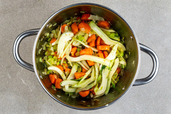 800ml Wasser in einem Wasserkocher aufkochen. Den Fenchel vierteln und in ca. 1cm breite Streifen schneiden, dabei die Stiele und das Strunkende entfernen. Die Karotte ggf. schälen, längs halbieren und in dünne Scheiben schneiden. Den Fenchel und die Karotten in den Topf geben und ca. 3Min. mitgaren.