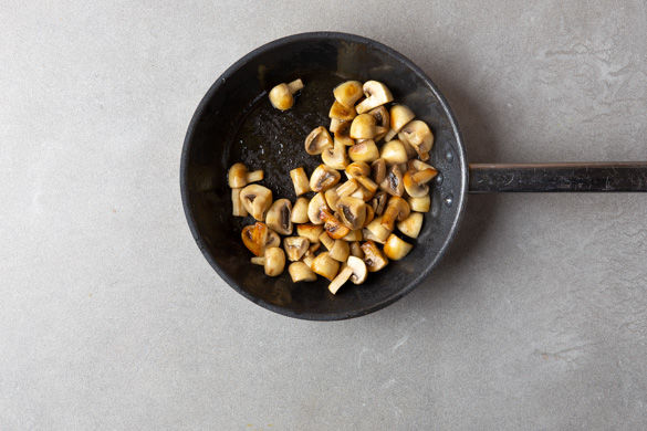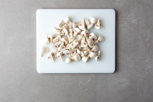Die Champignons ggf. mit Küchenpapier oder einer Bürste säubern und je nach Größe vierteln oder sechsteln.