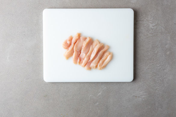 In einem mittelgroßen Topf ausreichend leicht gesalzenes Wasser für die Pasta aufsetzen. In der Zwischenzeit die Hähnchenbrust trocken tupfen und in dünne Streifen schneiden.