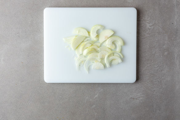 Die Zwiebeln schälen, halbieren und in dünne Scheiben schneiden.
