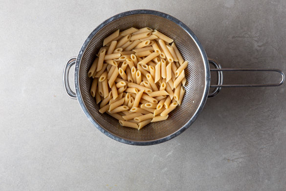 Sobald das Wasser kocht, die Penne darin in ca. 12–14Min. bissfest kochen. In ein Sieb abgießen und abtropfen lassen.