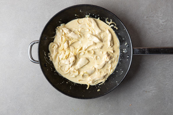Das Fleisch in einer großen Pfanne bei mittlerer Hitze mit 1EL Olivenöl 1–2Min. scharf anbraten. Die Zwiebeln zugeben und 1–2Min. mitbraten. Mit 1EL Mehl bestäuben, unterrühren und mit 200ml Wasser ablöschen. 1/2 Brühwürfel und die Crème fraîche hinzugeben und das Geschnetzelte 1–2Min. köcheln lassen. Mit Senf, Brathendelgewürz, Salz und Pfeffer würzen.