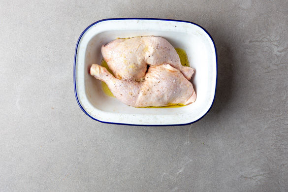Die Hähnchenschenkel mit Salz, Pfeffer und etwas Olivenöl würzen, in eine Auflaufform legen und im Ofen ca. 25–35Min. knusprig garen.