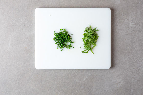 Die Minzeblätter von den Stängeln zupfen und in feine Streifen schneiden. Den Schnittlauch in feine Röllchen schneiden.