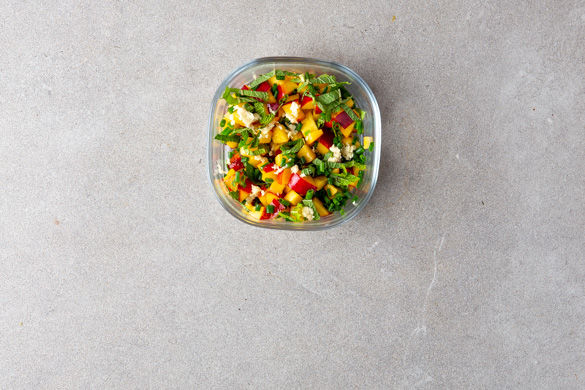 Währenddessen die Nektarinen halbieren, den Stein entfernen und die Nektarinen in kleine Würfel schneiden.