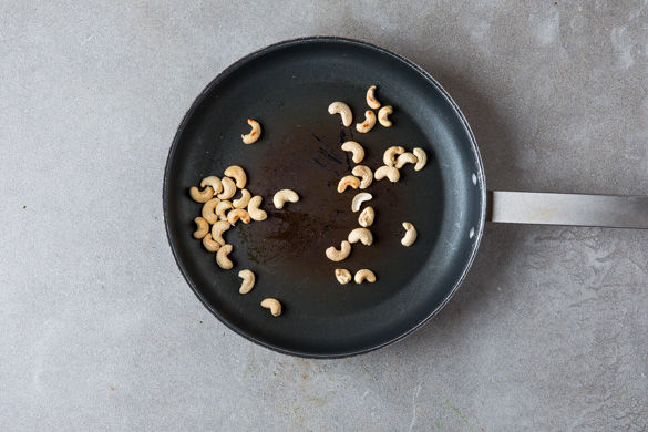 Die Cashewkerne in einer mittelgroßen Pfanne bei mittlerer Hitze ohne Fett ca. 2–3Min. goldbraun anrösten. Vorsicht, sie können schnell verbrennen. Zum Abkühlen aus der Pfanne nehmen und beiseitestellen.