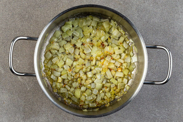 Den Backofen auf 220°C (200°C Umluft) vorheizen. 1L Wasser in einem Wasserkocher aufkochen. Die Zwiebeln schälen, halbieren und in feine Würfel schneiden, dann in einem großen Topf mit 4EL Butter bei mittlerer Hitze in 2–3Min. glasig anschwitzen.