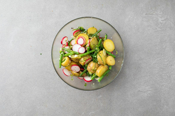 Die Lauchzwiebel in feine Ringe schneiden, 1EL Lauchzwiebeln für die Garnitur beiseitelegen. Die restlichen Lauchzwiebeln mit den Radieschen, den Bohnen, den Kartoffeln und der Salatsauce vermengen und den Salat mit Salz und Pfeffer abschmecken.