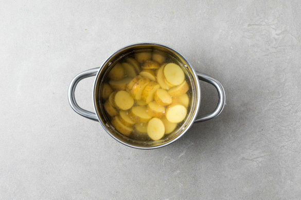 In einem mittelgroßen Topf ausreichend gesalzenes Wasser für die Bohnen zum Kochen bringen. Die Kartoffeln samt Schale in ca. 1cm dicke Scheiben schneiden und in einen zweiten mittelgroßen Topf geben. Mit gesalzenem Wasser bedecken, aufkochen und in 10–12Min. gar kochen.