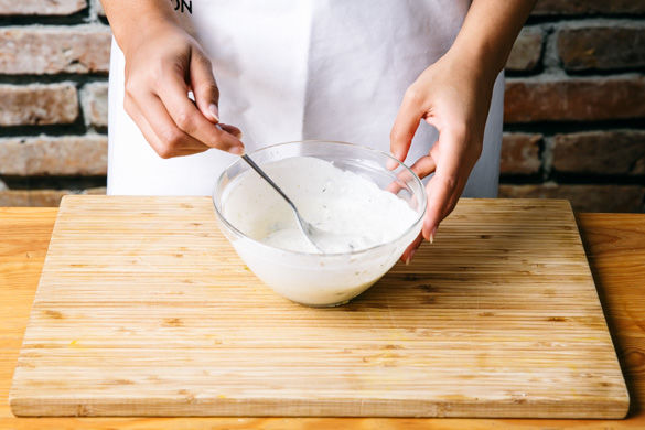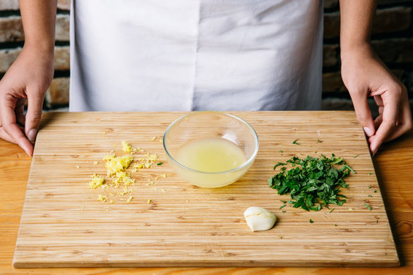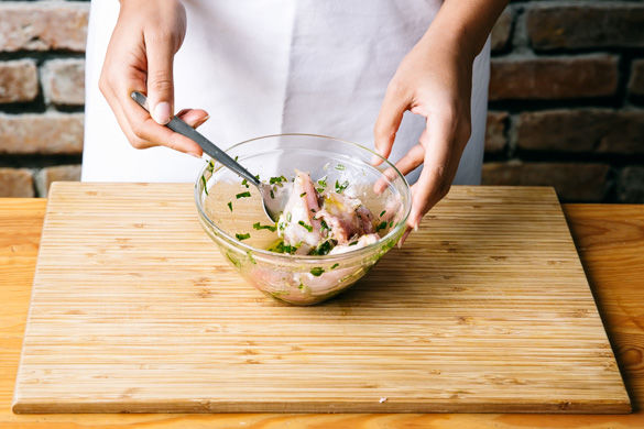 Das Hühnchenfleisch in ca. 3–4cm lange Stücke schneiden und mit dem Zitronen-Oregano-Öl verrühren.