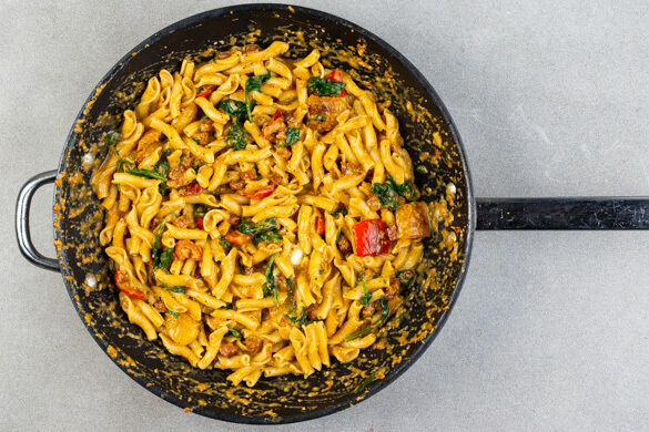 Allein in Spanien werden jährlich über 60.000 Tonnen Chorizo hergestellt. Die mit Paprika und Knoblauch gewürzte Rohwurst ist aber auch in vielen anderen Teilen der Welt beliebt, darunter Portugal, Frankreich und die Karibik. Sogar in Indien und auf den Philippinen gibt es Varianten. Wir kombinieren die herzhafte Wurst mit leckerer Pasta, frischem Spinat und einem selbst gemachten Paprika-Tomaten-Pesto mit Sonnenblumenkernen.