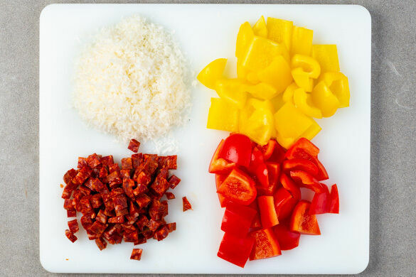 In einem mittelgroßen Topf ausreichend gesalzenes Wasser für die Pasta zum Kochen bringen. Die Paprika halbieren, entkernen und grob würfeln. Die Chorizo in ca. 1cm kleine Würfel schneiden. Den Käse fein reiben.