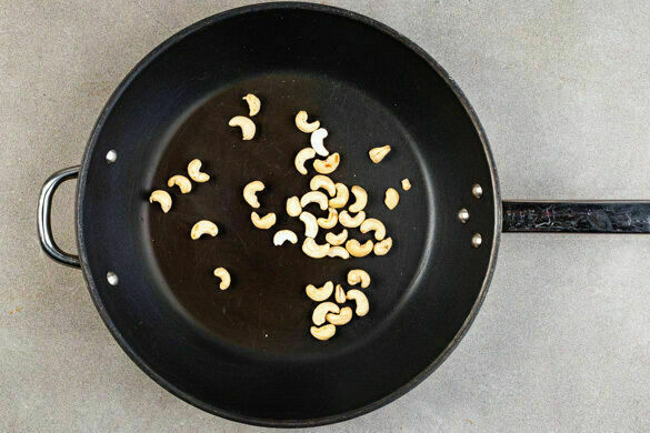 Die Cashews in einer großen Pfanne ohne Zugabe von Fett bei mittlerer Hitze 1–2Min. goldbraun anrösten. Vorsicht, sie können schnell zu dunkel werden. Zum Abkühlen aus der Pfanne nehmen und beiseitestellen.