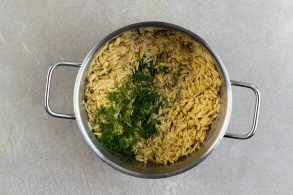 Den Dill samt Stängeln grob schneiden. Die Pasta mit der ½ des Dills, 2EL Olivenöl, 2EL Essig und 1 kräftigen Prise Pfeffer verfeinern. Die Pasta auf Teller verteilen und das Gemüse und die Garnelen darauf anrichten. Mit dem restlichen Dill garnieren und servieren.