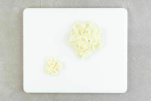 Den Backofen auf 240°C (220°C Umluft) vorheizen. Die Zwiebeln schälen, halbieren und in dünne Streifen schneiden. Den Knoblauch schälen und in dünne Scheibchen schneiden.