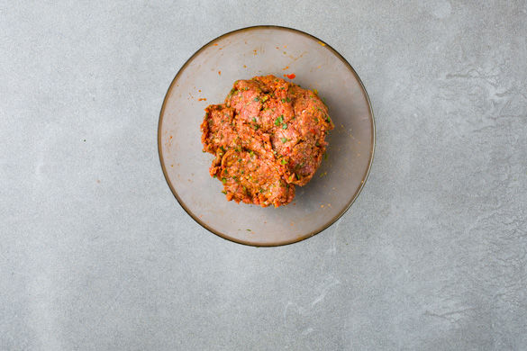 Inzwischen den Koriander samt Stängeln fein hacken und mit dem übrigen Knoblauch, dem Tomatenmark, der Berbere-Gewürzmischung und 2 Prisen Salz zum Rinderhackfleisch geben und alles gut verkneten.