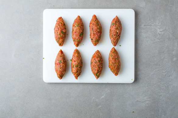 Aus dem Hackfleisch ca. 8 gleich große Portionen abtrennen und aus jeder Portion mit feuchten Händen 1cm dicke, ovale Laibchen formen.