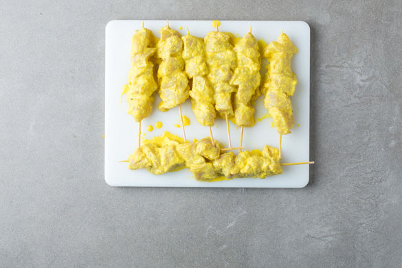 Das marinierte Hühnerfleisch auf die Holzspieße ziehen und anschließend die überschüssige Marinade davon abtropfen lassen.