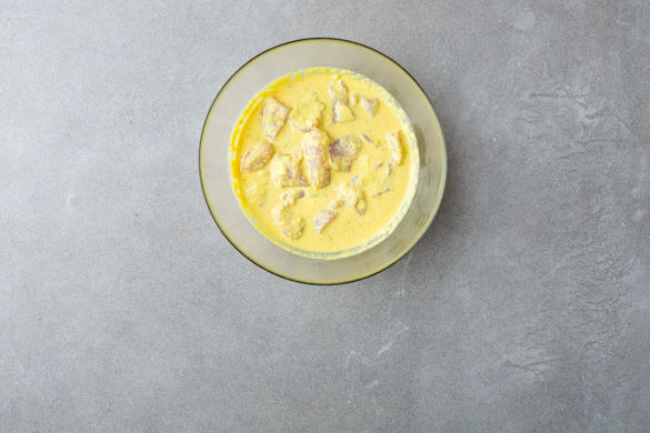 Das Hühnerfleisch in 2cm große Würfel schneiden und mit der Joghurtmarinade vermengen. Mit 1EL Zitronensaft, 1/2TL Salz und etwas Pfeffer würzen, dann ca. 10Min. ziehen lassen.