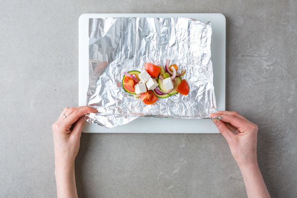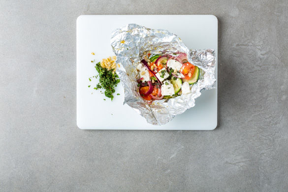 Nun 4 großzügige Stücke Alufolie nebeneinander auslegen. Das gewürzte Gemüse auf den vorbereiteten Stücken Alufolie verteilen und jeweils 4–5 Stücke Feta daraufgeben. Die Aluminiumfolie darüber zusammenlegen und fest verschließen, indem du die Päckchen eindrehst.