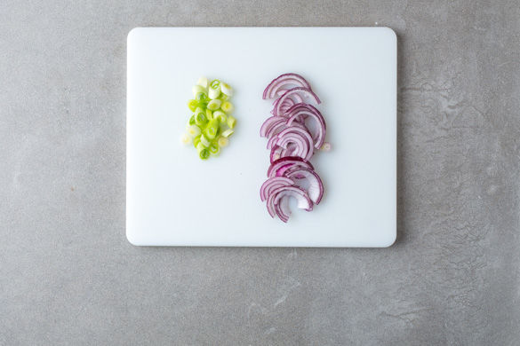 Die rote Zwiebel schälen und in ca. 1cm dicke Ringe schneiden. Die Ringe auseinanderziehen. Die Lauchzwiebel putzen und in schräge, dünne Ringe schneiden.
