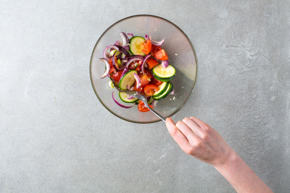 Die Zucchinienden abschneiden, dann die Zucchini in 0,5cm dicke Scheiben schneiden. Die Tomaten achteln und den Strunk entfernen. Den Knoblauch schälen und fein hacken. Die roten Zwiebeln, die Lauchzwiebeln, die Zucchini, die Tomaten und den Knoblauch in einer Schüssel mit 2EL Olivenöl, 1/2TL Salz und etwas Pfeffer vermengen.