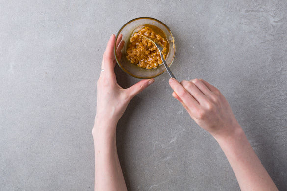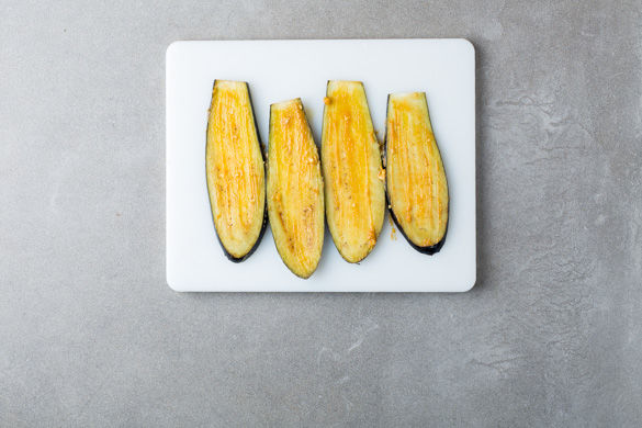 Die Auberginen sorgfältig von beiden Seiten mit der Würzpaste bepinseln.