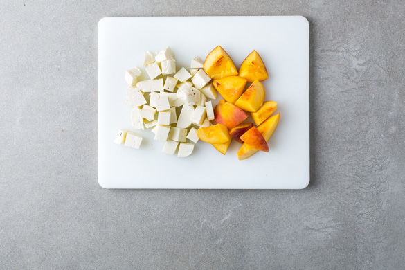 Den Halloumi in gleichmäßige, 2cm große Würfel schneiden. Die Pfirsiche entweder halbieren und den Kern entfernen oder das Fruchtfleisch eng um den Kern herum abschneiden. Die Pfirsiche in 1–2cm breite Spalten schneiden.