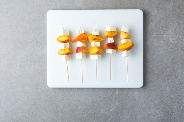 Den Halloumi und die Pfirsichstücke abwechselnd auf die Spieße ziehen.