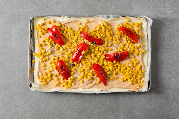Den Backofen auf 240°C (220°C Umluft) vorheizen. Die Paprika halbieren, entkernen und in ca. 2cm breite Streifen schneiden. Die Zwiebeln schälen und in hauchdünne Ringe schneiden. Den Mais in einem Sieb abtropfen lassen.