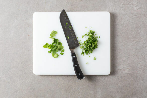 Den Koriander samt Stängeln fein schneiden. Die Pizzen nach Belieben in Stücke schneiden und mit den eingelegten Zwiebeln und dem Koriander garniert servieren.