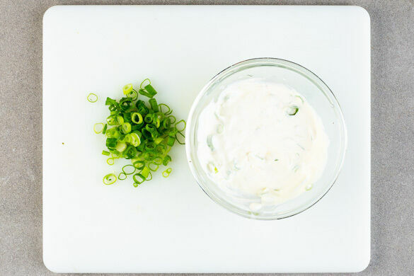 Den Backofen auf 200°C (180°C Umluft) vorheizen. Die Lauchzwiebel in feine Ringe schneiden. Den Meerrettich schälen und fein reiben. Die ½ der Lauchzwiebeln mit der Crème fraîche und dem Meerrettich nach Geschmack verrühren.