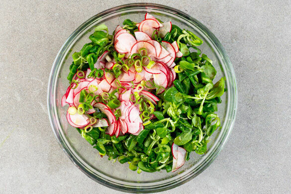 Währenddessen die ½ der Radieschen halbieren und in dünne Scheiben schneiden. Tipp: Wer mag, kann auch alle Radieschen verwenden.