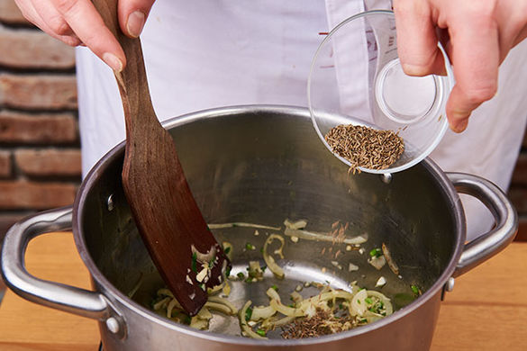 Die Zwiebeln in einem großen Topf mit 1EL Olivenöl bei mittlerer Hitze ca. 2Min. leicht goldbraun anbraten. Den Knoblauch und den Kreuzkümmel hinzugeben und 30Sek. mitbraten.