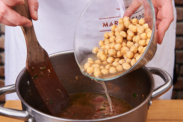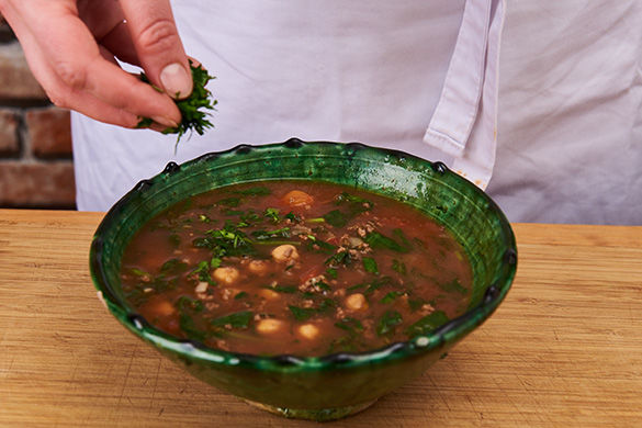 Das Fleisch mit dem kochenden Wasser ablöschen. Den Brühwürfel, die gehackten Tomaten, die Kichererbsen mit Flüssigkeit und die 1/2 der Petersilie zugeben und die Suppe 5Min. sanft köcheln lassen.