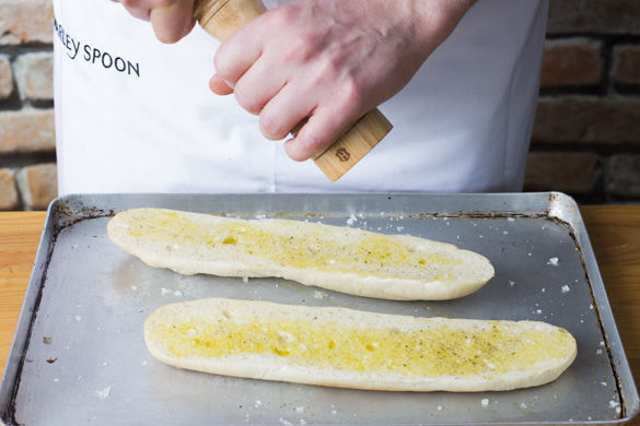 Die Baguettebrötchen halbieren, mit etwas Olivenöl beträufeln und mit Salz und Pfeffer würzen. Im Ofen in ca. 2–4Min. goldbraun rösten. Den Babyspinat in die Suppe geben und 2–3Min. mitköcheln lassen.
