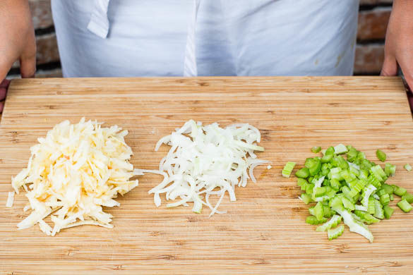 Die Zwiebel schälen, halbieren und in feine Halbringe schneiden. Den Stangensellerie der Länge nach halbieren und in möglichst dünne Scheiben schneiden. Den Apfel vierteln, entkernen und grob raspeln.