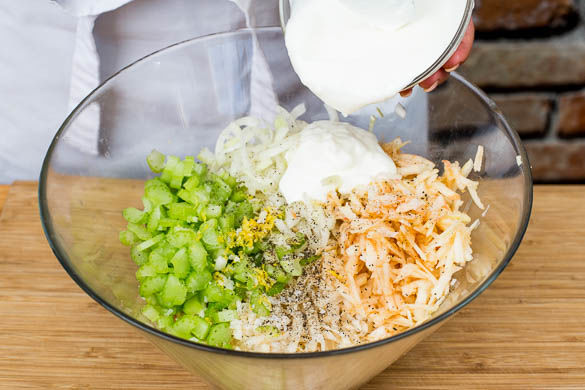 Den Knollensellerie, den Stangensellerie, die Zwiebeln und den Apfel in einer großen Schüssel mit dem Joghurt, 2EL Essig und etwas Zucker mischen. Mit Salz und Pfeffer kräftig abschmecken.