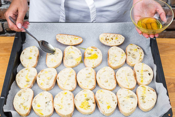 Das Baguettebrötchen in dünne Scheiben schneiden, diese auf einem mit Backpapier ausgelegten Backblech verteilen und mit 1–2EL Olivenöl beträufeln. Im Ofen in ca. 5–7Min. goldbraun backen.