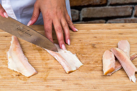 Die geräucherten Forellenfilets vorsichtig in mundgerechte Stücke zupfen oder schneiden.