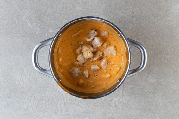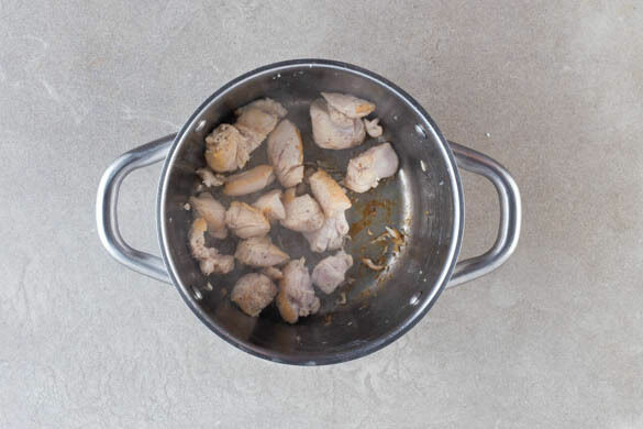 Das Fleisch trocken tupfen, in mundgerechte Stücke schneiden und in einem mittelgroßen Topf mit 1EL Butter oder Pflanzenöl, 1 kräftigen Prise Salz und 1 Prise Pfeffer bei mittlerer Hitze in ca. 3Min. goldbraun anbraten, das Fleisch muss noch nicht gar sein. Das Fleisch aus dem Topf nehmen und auf einem Teller beiseitestellen.