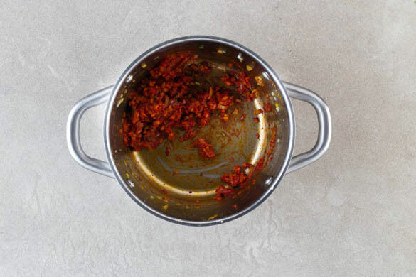 Die Zwiebeln in demselben Topf mit 1EL Butter oder Pflanzenöl und 1 Prise Salz 3–4Min. anschwitzen. Den Ingwer, die Korianderstängel sowie 2TL Currypulver oder mehr nach Geschmack hinzufügen und ca. 1Min. unter Rühren braten. Die ½ des Tomatenmarks dazugeben und ca. 1Min. mitbraten.
