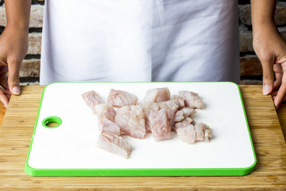 Den Fisch mit kaltem Wasser abspülen, trocken tupfen und evtl. vorhandene Gräten mit einer Pinzette entfernen. In 2–3cm große Stücke schneiden und leicht salzen.