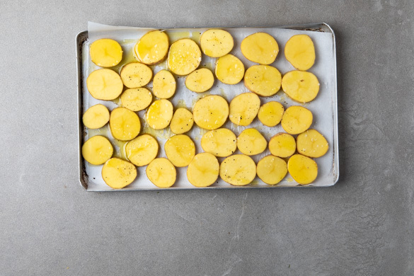 Den Backofen auf 220°C (200°C Umluft) vorheizen. Die Kartoffeln samt Schale in ca. 2cm dicke Scheiben schneiden, auf einem mit Backpapier ausgelegten Backblech mit Salz, Pfeffer und 1EL Olivenöl vermengen und 20–30Min. im Ofen goldbraun rösten.