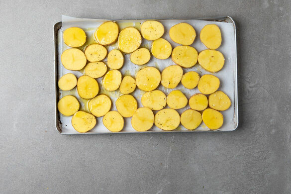 Den Backofen auf 220°C (200°C Umluft) vorheizen. Die Kartoffeln samt Schale in ca. 2cm dicke Scheiben schneiden, auf einem mit Backpapier ausgelegten Backblech mit Salz, Pfeffer und 2EL Olivenöl vermengen und 20–30Min. im Ofen goldbraun rösten.