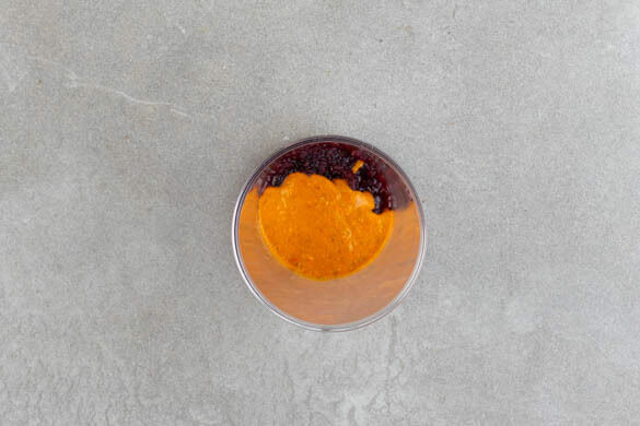 Den Knoblauch schälen und halbieren, dann mit der ½ der Harissapaste oder mehr nach Geschmack, den Kapern und 3EL Olivenöl in ein hohes Gefäß geben und mit einem Stabmixer glatt pürieren. Mit Salz und Pfeffer abschmecken. Den Stabmixer abspülen und aufbewahren.