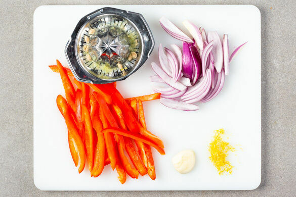 Die Paprika vierteln, entkernen und in dünne Streifen schneiden. Die Zwiebel schälen, halbieren und in feine Streifen schneiden. Den Knoblauch schälen. Die Zitronenschale abreiben, dann die Zitrone halbieren und auspressen.