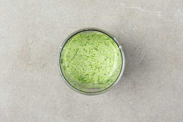 Die Petersilie und die ½ des Dills samt Stängeln grob schneiden. Den Schnittlauch in Röllchen schneiden. Die Kräuter, den Knoblauch und 1TL Zitronenschale mit 1EL Zitronensaft, der Mayonnaise, 1EL Pflanzenöl, 2–3EL Wasser und je 1 kräftigen Prise Salz und Pfeffer in einem hohen Gefäß pürieren. Ggf. mehr Wasser zufügen und erneut mit Salz und Pfeffer abschmecken.